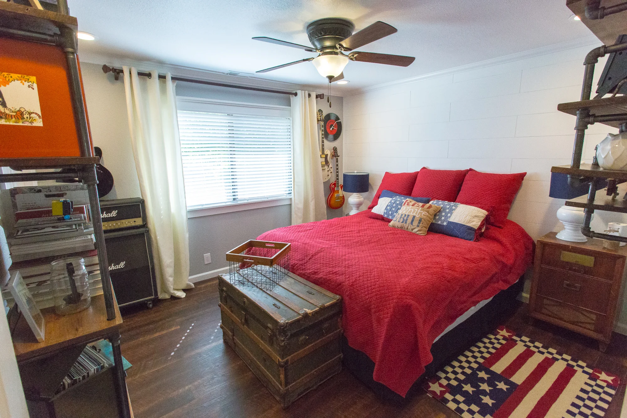 In order to add some type of texture to the room and to set off the wall where the bed would be placed we decided to create a faux "ship-lap" wall. I took 4x8 foot sheets of 1/8" plywood and ripped them down on the table saw to 6"x4' planks. We then nailed them to the wall. We left all the nail holes exposed to create that rustic feel.