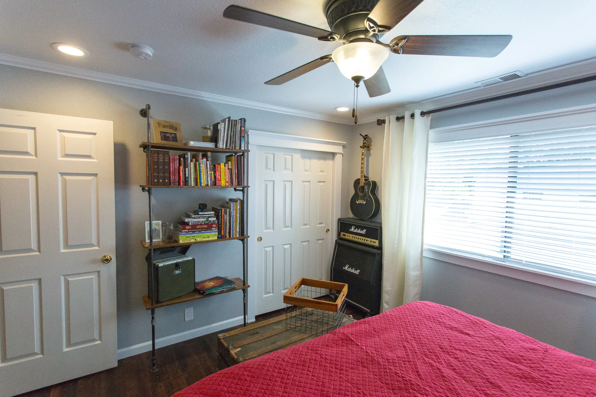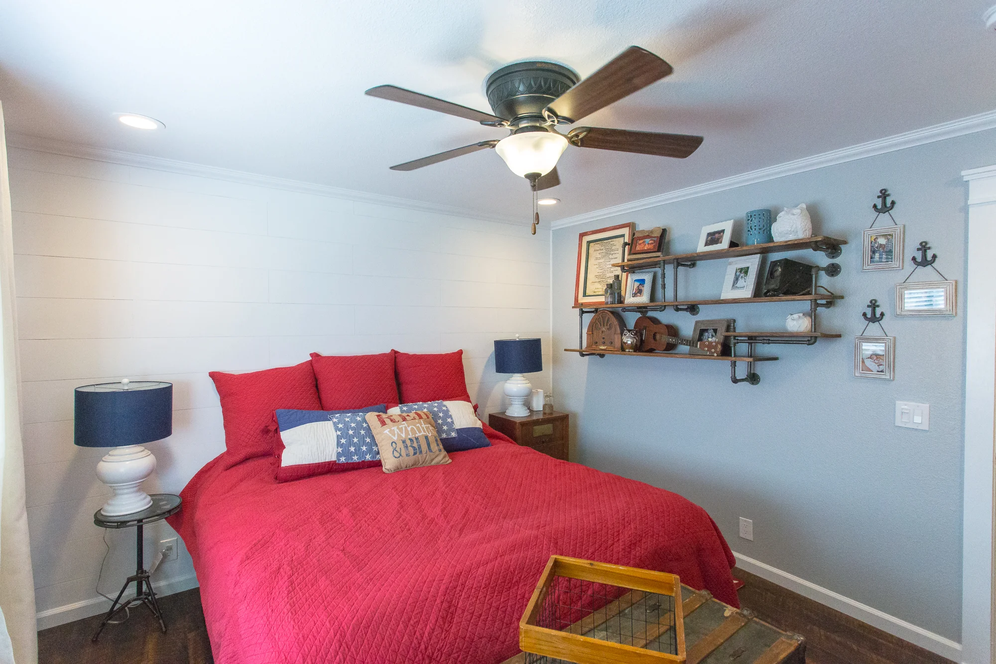 When we purchased the home most of the rooms walls were painted the same color as the ceilings. This is a pet pieve of mine because it makes the room feel so much shorter with no seperation. We decided to go with a gray eggshell paint for the walls and an eggshell white for the cieling and ship-lap wall. All of the trim was painted with a semi-gloss white to set it apart and make for easy dust cleaning.