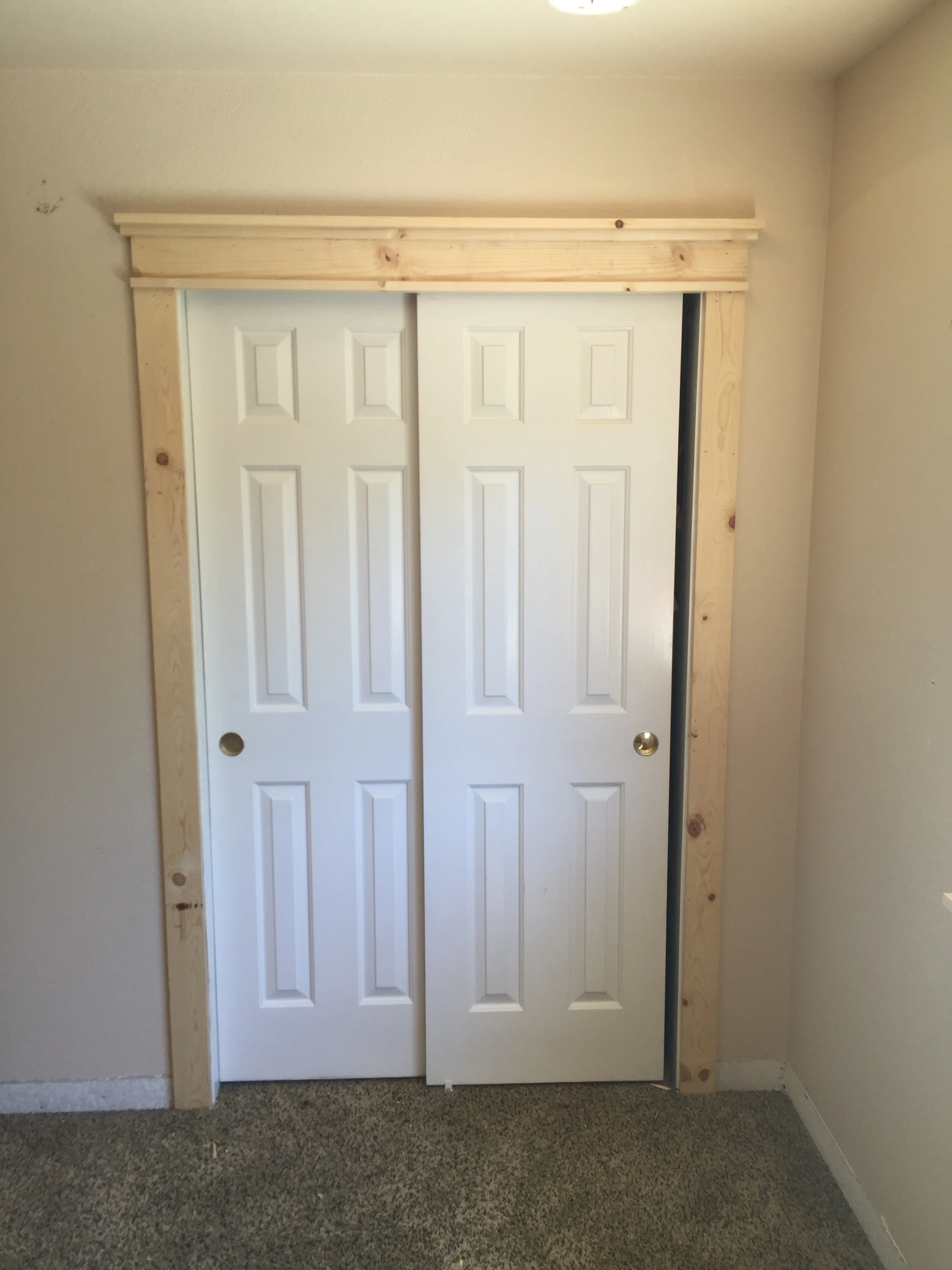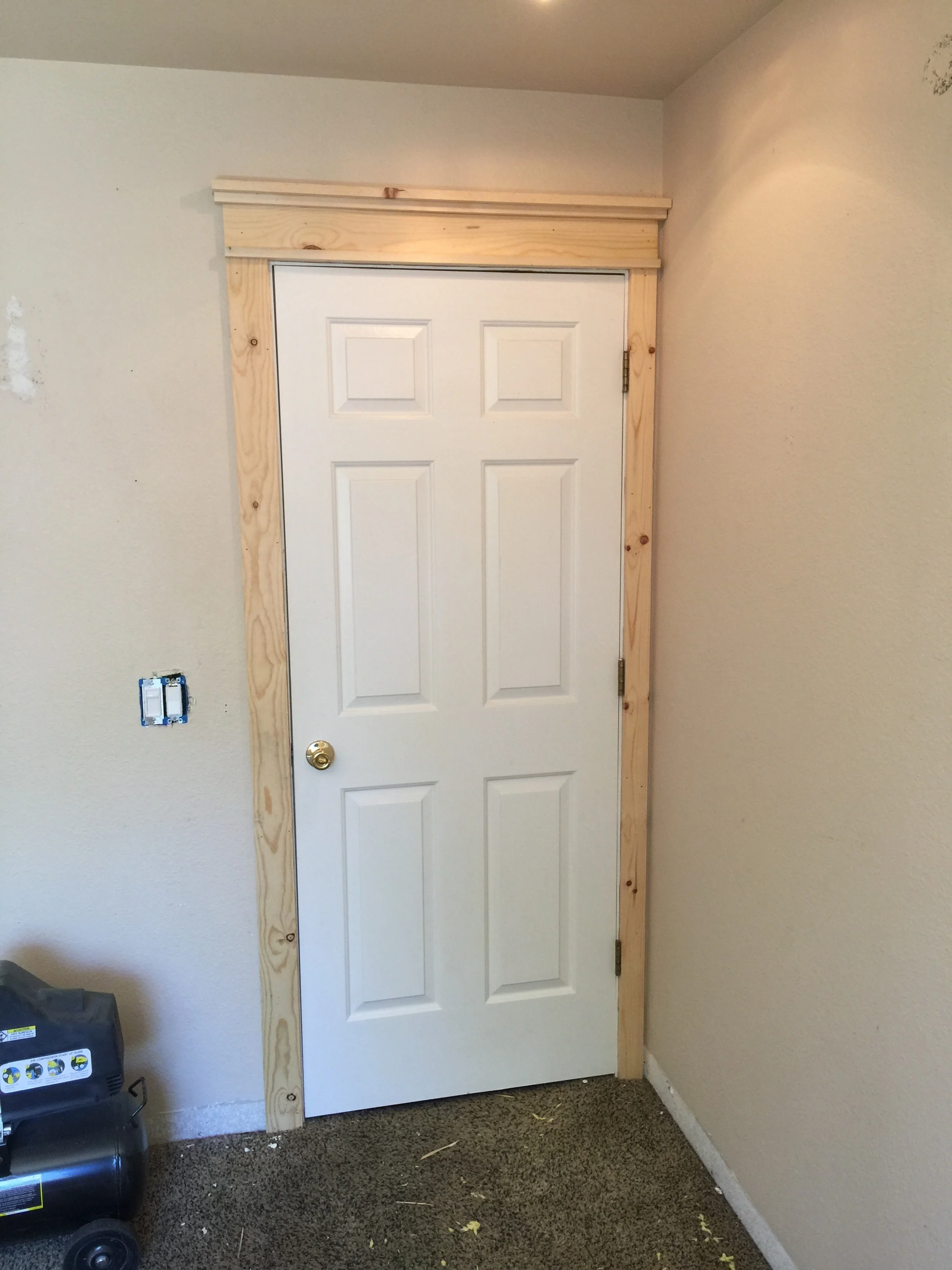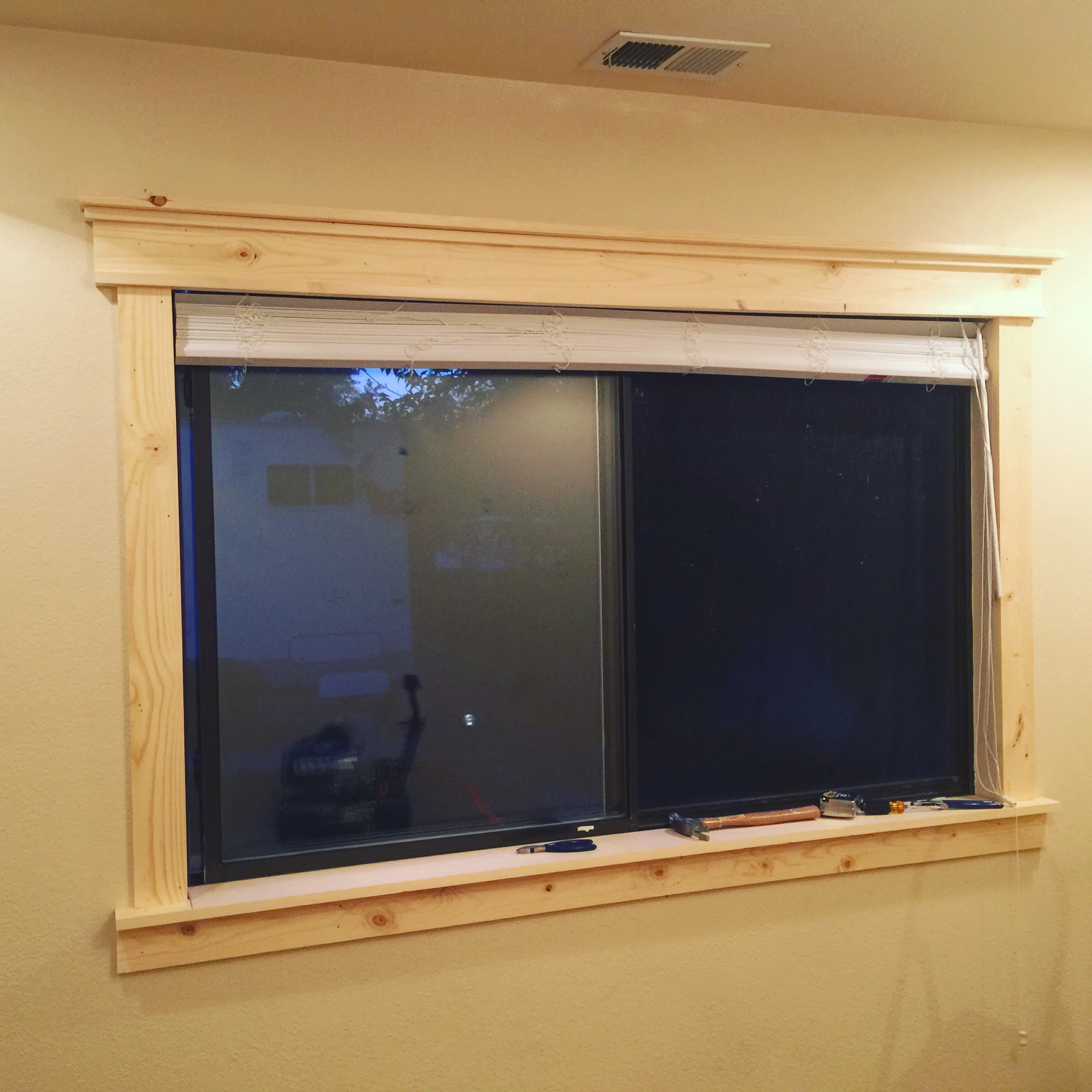 Next, My wife and I came up with a design that we were both happy with for the windows and door casings. I constructed the trim from pre-milled pine from the a big box store, then sanded, filled and caulked all the seams before paint.