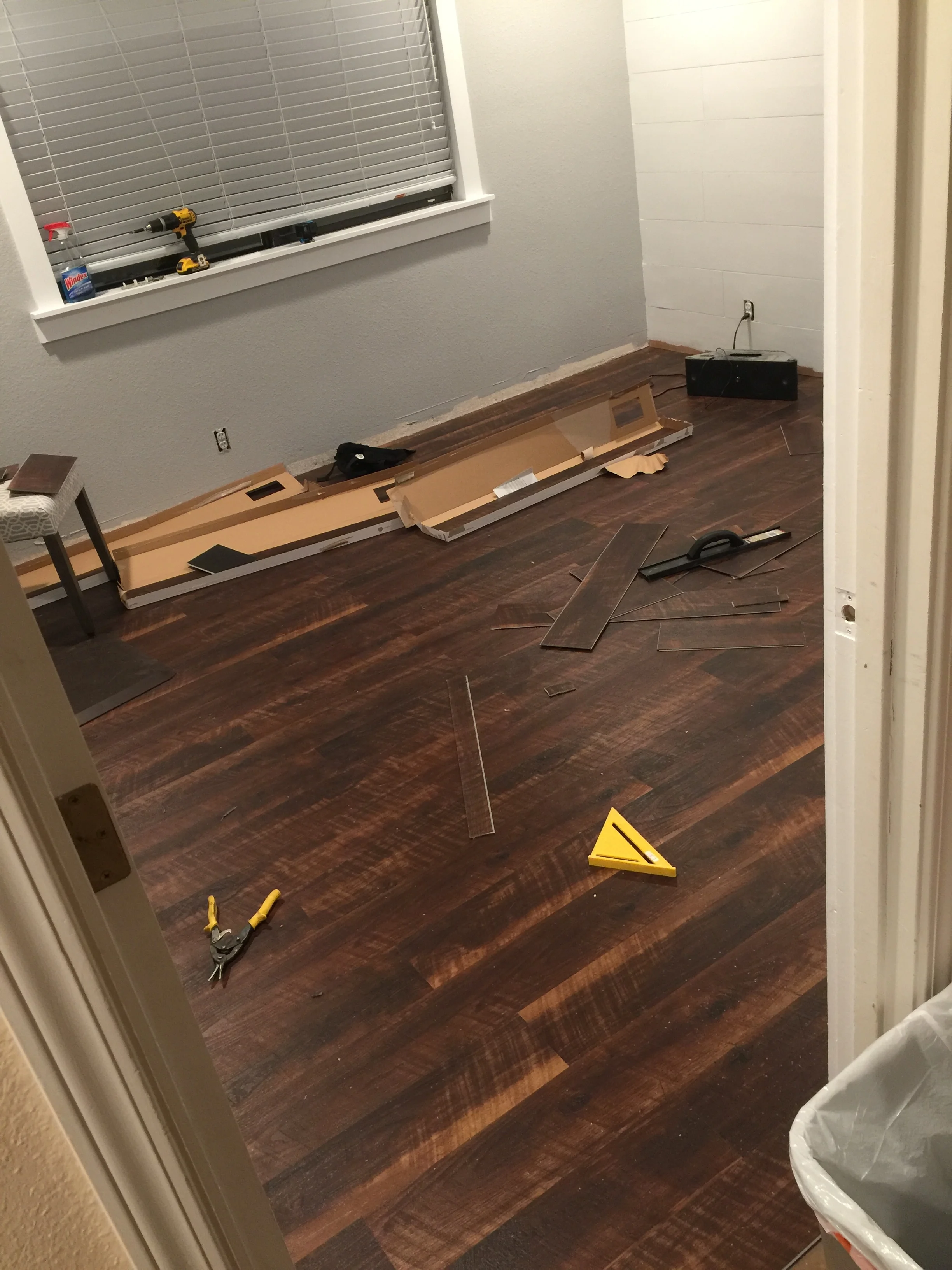 Next I laid down the floor. It is a vinyl flooring that has the pad and moisture barrier built into the underside of each plank. It is easilly installed by snapping together making it easy to get a room done in an evening after figuring out a good rythm.